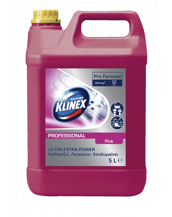 Η Klinex Professional Ultra Extra Power Pink είναι παχύρρευστη χλωρίνη κατάλληλη για καθαρισμό και απολύμανση όλων των σκληρών επιφανειών, όπως μεγάλες επιφάνειες μπάνιου και κουζίνας, νεροχύτες και δάπεδα . Η σύνθεσή της σε μορφή gel προσκολλάται καλύτερα στις επιφάνειες προσφέροντας προστασία που διαρκεί περισσότερο. Εμποδίζει τον σχηματισμό αλάτων. Κατάλληλη και για λεύκανση ρούχων. Με εγκριση από τον Ε.Ο.Φ.